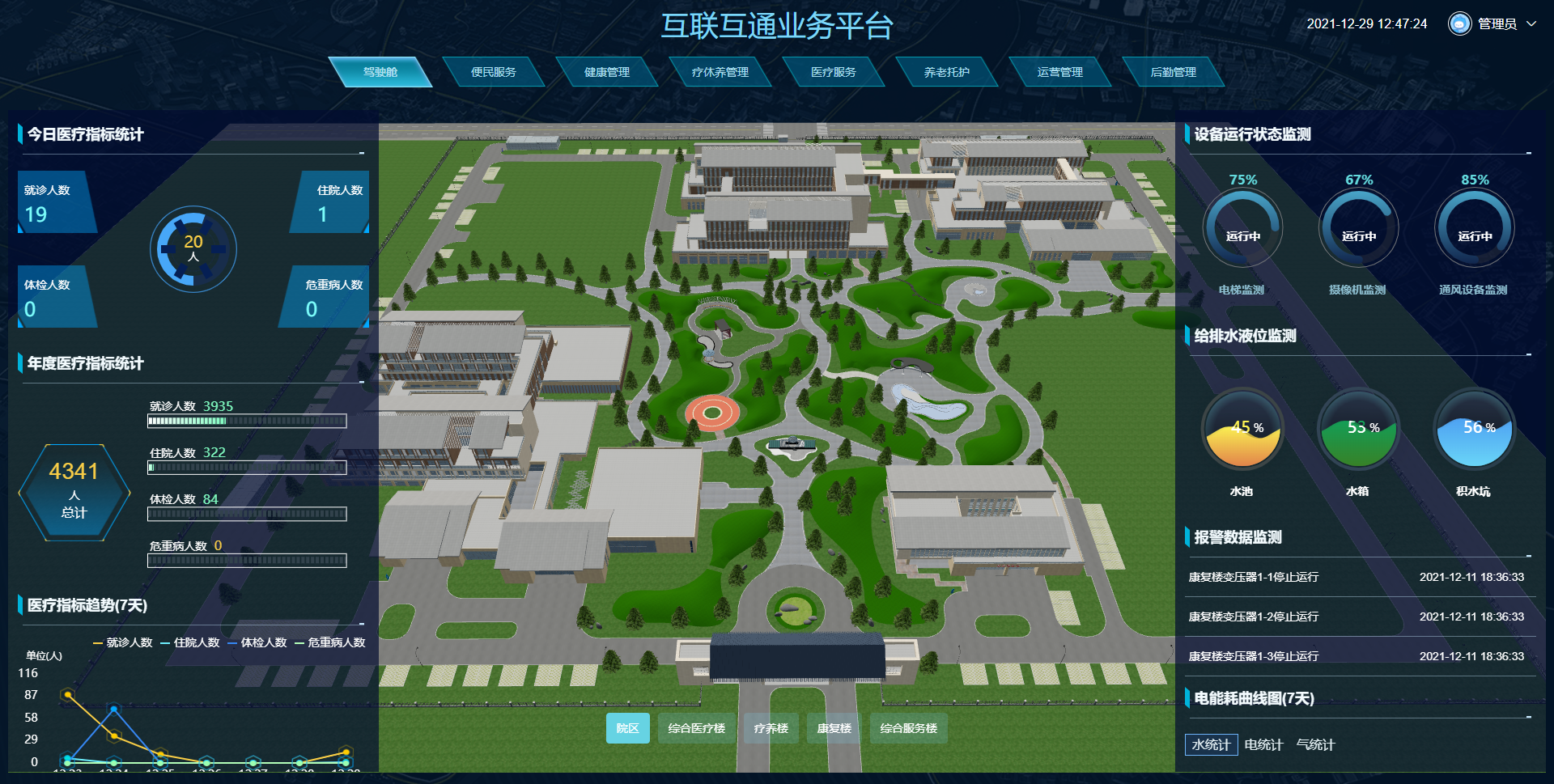 宁夏工人疗养院是一家集医疗康复、职工休养、健康体检、老年养老与托护“四大功能”为一体的综合性医院。此次医疗信息化建设项目立足于医院功能定位和未来业务发展规划,根据实际情况,着眼于未来,通过软硬件结合。互联互通平台整合医疗、运营、养老、疗休养、体检五大院方核心业务,形成一套完善的可视化综合管理平台,平台主要包括大数据可视化平台、3D BIM可视化、业务系统集成、楼宇自控系统集成、安防系统集成5大板块。