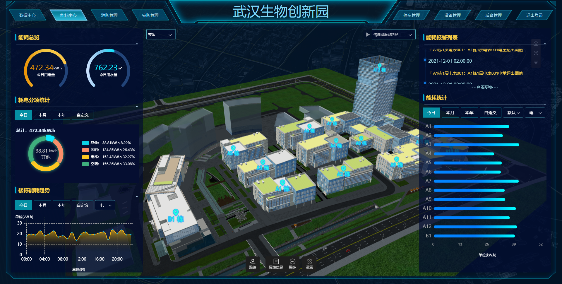 武汉生物创新园是武汉市重点布局集约化产业承载空间,开展以生物医学、医疗大数据为方向的产品研发产业基地。该应用通过搭建基础的三维可视化平台,建成基于BIM的智慧园区管理的基础框架,通过集成整合各物联网平台及业务系统等达到提高安全、降低风险、提升管理、提高管控效率。系统主要实现土建可视化、能耗可视化管理、设备可视化管理、安防可视化管理、消防安全可视化管理、停车场状态可视化管理和电梯状态可视化管理等几大模块。